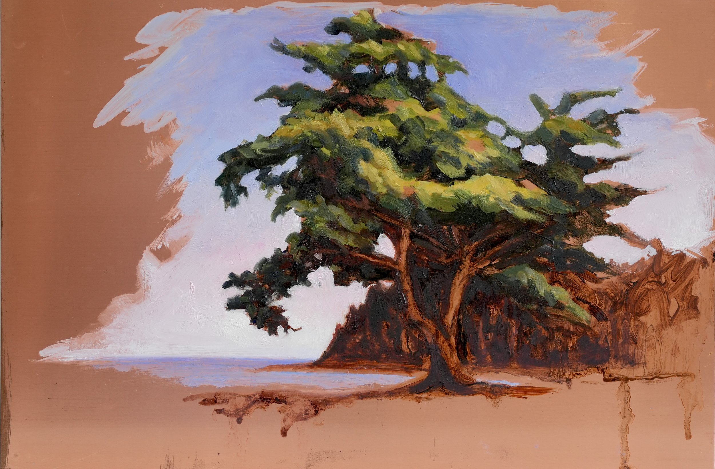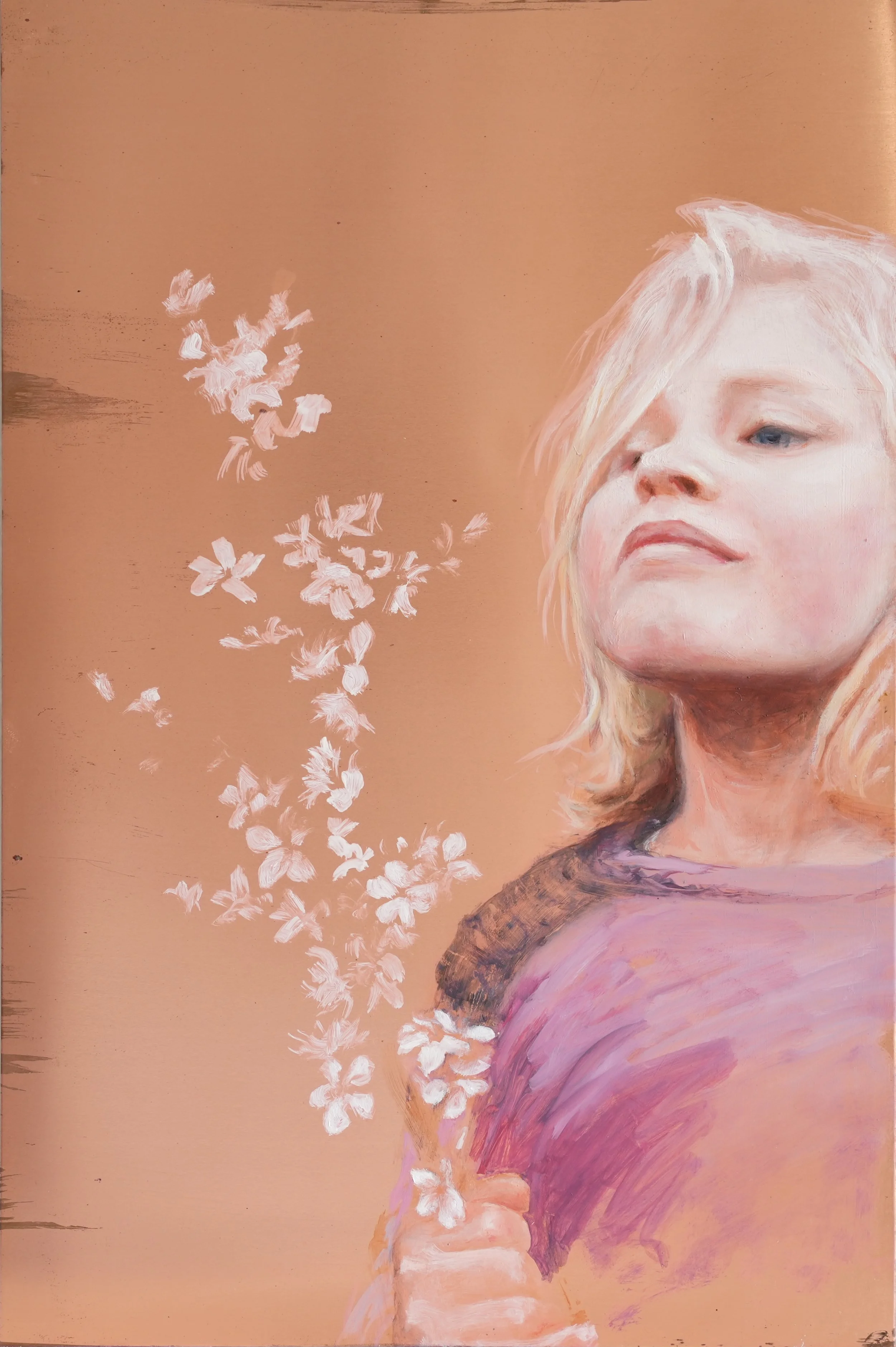 Painted in oil directly onto copper panels, these works leave areas of exposed metal that shift and glow as the light changes, moving subtly with their surroundings and hinting at something sacred and unseen.